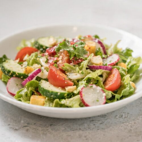 This salad leans into texture—cool, crunchy, and crisp. The homemade “crispers” (seasoned, baked pita or tortilla bites) add a savory crunch that doesn’t go soggy fast.